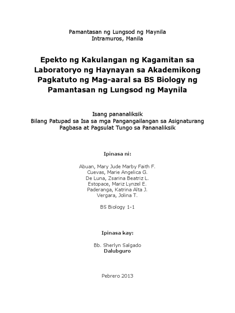 Epekto Ng Kakulangan Ng Kagamitan Sa Laboratoryo Ng Haynayan Sa Akademikong Pagkatuto Ng Mag Aaral Sa Bs Biology Ng Pamantasan Ng Lungsod Ng Maynila Pdf