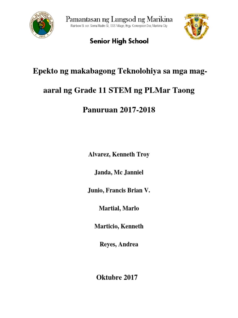 Ito ay ay nagpapadali sa mga gawain ng mga tao tulad ng pilipino. INTEGRATED SCHOOL TAONG PANURUAN 2017-2018 Mga Sulating Pananaliksik na iniharap sa Klase ng Filipino Senior High School Maimpis Integrated School Bilang Kahangian sa Filipino 11 Pagbasa at Pagsususri ng. Paggamit ng makabagong teknolohiya saGrap 1 pag aaral ng.
