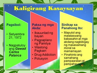 Credits is at the end of the video. Panitikan sa Panahon ng Bagong Lipunan o Batas Militar 1972-1986 panahon ng Bagong Lipunan Setyembre 211972 idineklara ang Martial Law Bagong Lipunan-pagbabagong tatag Naging makatotohanan ang paksa ng mga ito at natuon sa tema ng Bagong Lipunan. Itala ang kaugnayan 2.