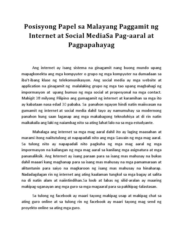 19072017 Ang posisyong papel ay isang papel na nagbibigay ng posisyon ng may-akda ukol sa partikular na isyu. Research Paper Tungkol Sa Epekto Ng Makabagong Teknolohiya Sample Essay For Student Visa Application First Paragraph For Essay Hamlet And Revenge Essay Cheap Dissertation. POSISYONG PAPEL HINGGIL SA MALING PAG-GAMIT NG TEKNOLOHIYA NG MGA ESTUDYANTE.
