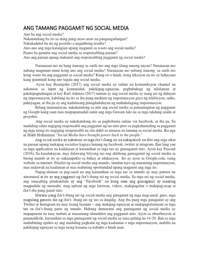 Ang Tamang Paggamit Ng Social Media O Internet Pdf