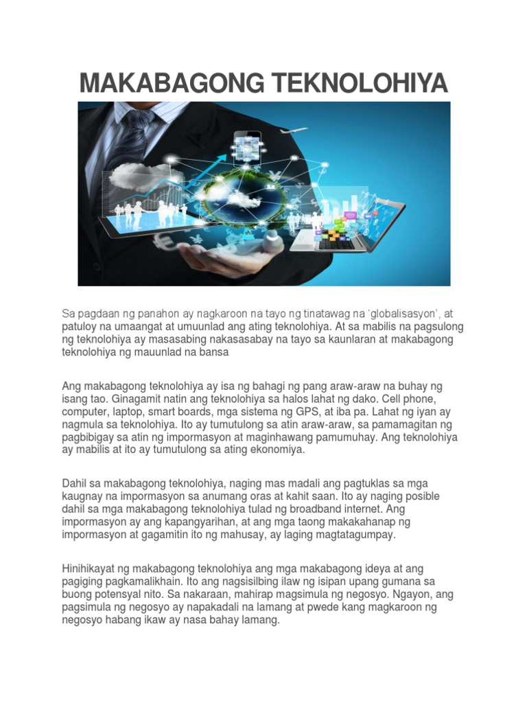 Pag-aaral sa Kahalagahan at Kalagayan ng Panitikang Pilipino sa Makabagong Panahon Ang Panitikan ay isang bagay na karamihan ng mga tao ay madalas nakakasalamuha. EPEKTO NG TEKNOLOHIYA SA KALIKASAN AT SA BANSA. Sa pag gamit ng teknolohiya hindi lang bansakalikasan o kung ano pa ang naapektuhan kundi tayo ring mga gumagamit nito sa sobrang paggamit ng teknolohiya maari iton magdulot ng vission problems lalo na sa sobrang pag gamit nito maari ring makasama.