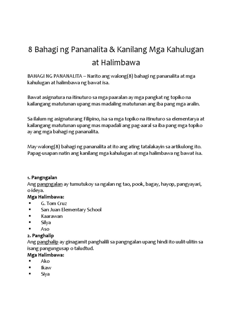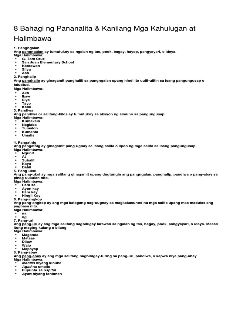 Sampung Bahagi Ng Pananalita At Mga Halimbawa Nito Panlabas Bahagi