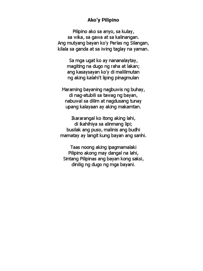 Ngunit taos-puso kong ikinatha itong tula. Ang katutubong panitikan ng mga Pilipino ay nabihisan ng kulturang Espanyol at paksaing panrelihiyon. Wikang Filipino --- isa sa mga kayamanang ating natanggap mula sa ating mga ninuno na nagsisilbing instrumento para sa pambansang pagkaka-unawaan at tulay sa magandang.