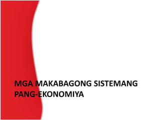 Sistemang Pang-ekonomiya Ang paraan ng pagsasaayos ng ibat ibang yunit upang makatugon sa suliraning pangkabuhayan ng isang lipunan. Ang ilan sa mga makabagong ideya sa negosyo ay siguradong tatunog dahil inilunsad ang mga ito. Impormasyon tungkol sa trabaho Paglago ng ekonomiya at mga makabagong pagbabago.