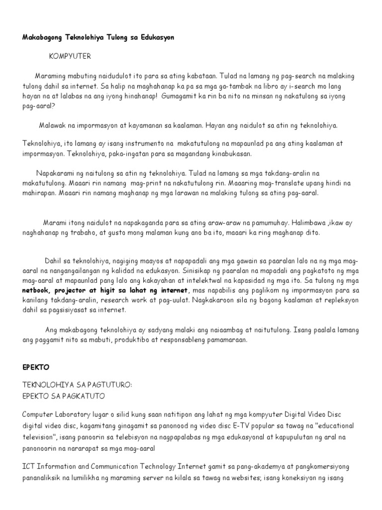 View Nakakatulong ba ang teknolohiyadocx from AA 1Nakakatulong ba ang Teknolohiya. Makabagong teknolohiya nakatutulong nga ba sa atin. Benepisyo ng makabagong teknolohiya sa mga estudyante.