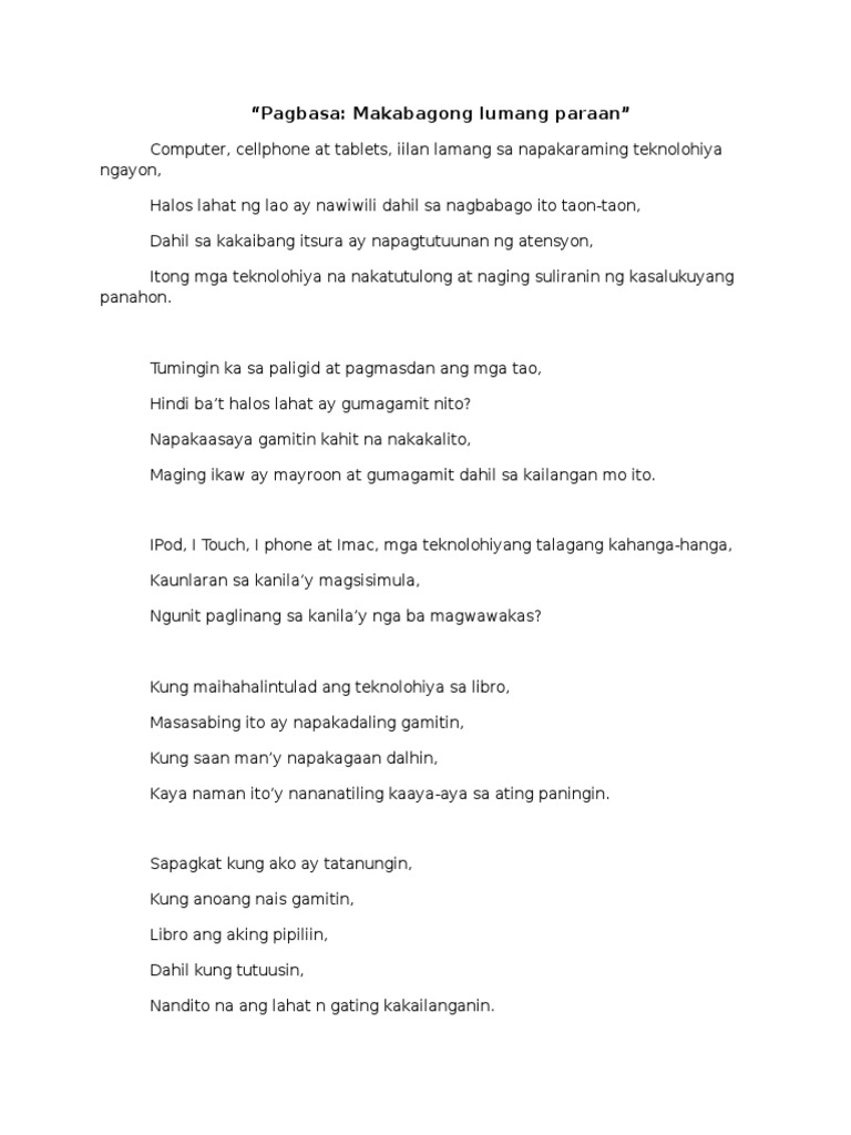 Nakakatulong din ito sa paglinang ng lohikong pag-iisip at paglutas sa suliranin. 20112014 THESIS - WIKANG FILIPINO SA MAKABAGONG PANAHON 1. Katulad ng iba pang naunang panitikan ang tula ay kinakailangan ding makisunod sa uri ng panahon.