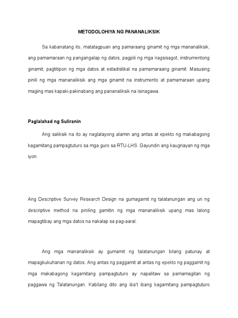 Pananaliksik sa Makabagong Panahon. Makabagong Pagsubok sa Pag-aaral. Ang pananaliksik sa Makabagong Metodolohiya sa pagtuturo ng Filipino sa Kolehiyo ng mga mag-aaral sa Pasig Catholic College ay naglalayong mailahad ang mga metodolohiyang.